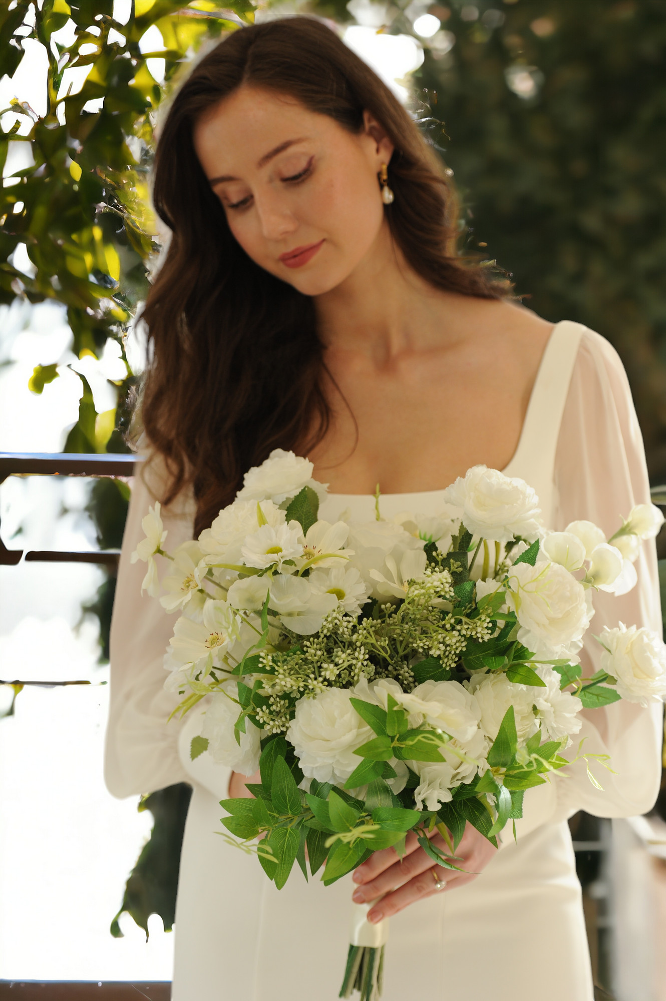 Alison Bridal Bouquet, brings together a soft mix of faux white ranunculus, sweet pea, viburnum berry, jasmine, and wildflower daisy. It’s effortlessly beautiful and perfect for adding a touch of class to your big day.