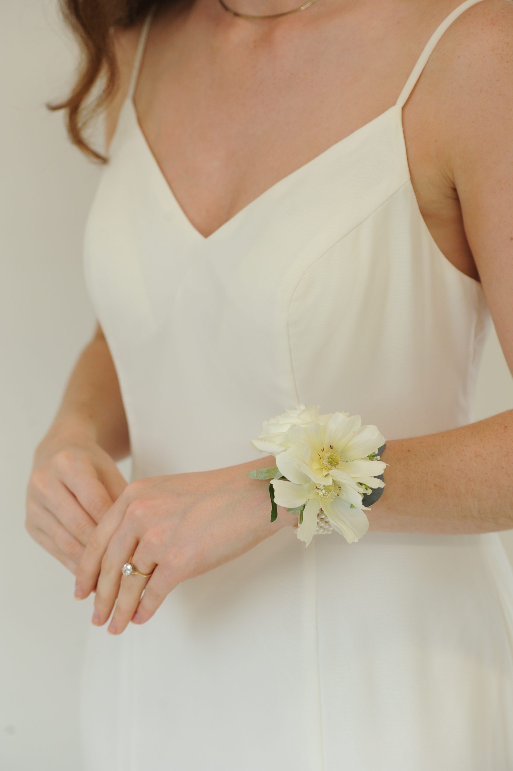 The Alison Corsage features an elegant cream rose and a garden poppy head. It is complete with a beautiful elasticated pearl bracelet which will compliment any outfit. Premium Silk Florals