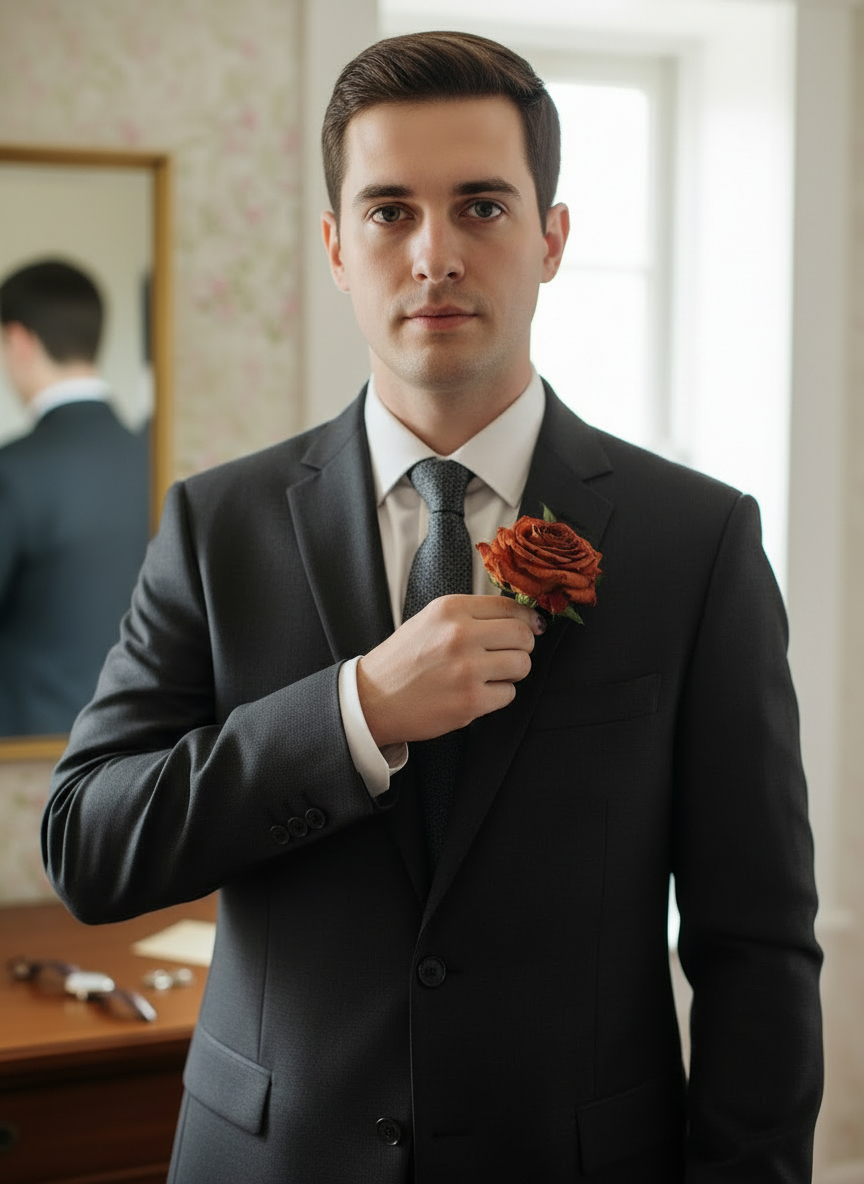 The Charlotte buttonhole features a simple burnt orange rose to compliment the rest of the collection. It comes with a safety pin included so it can be easily attached.