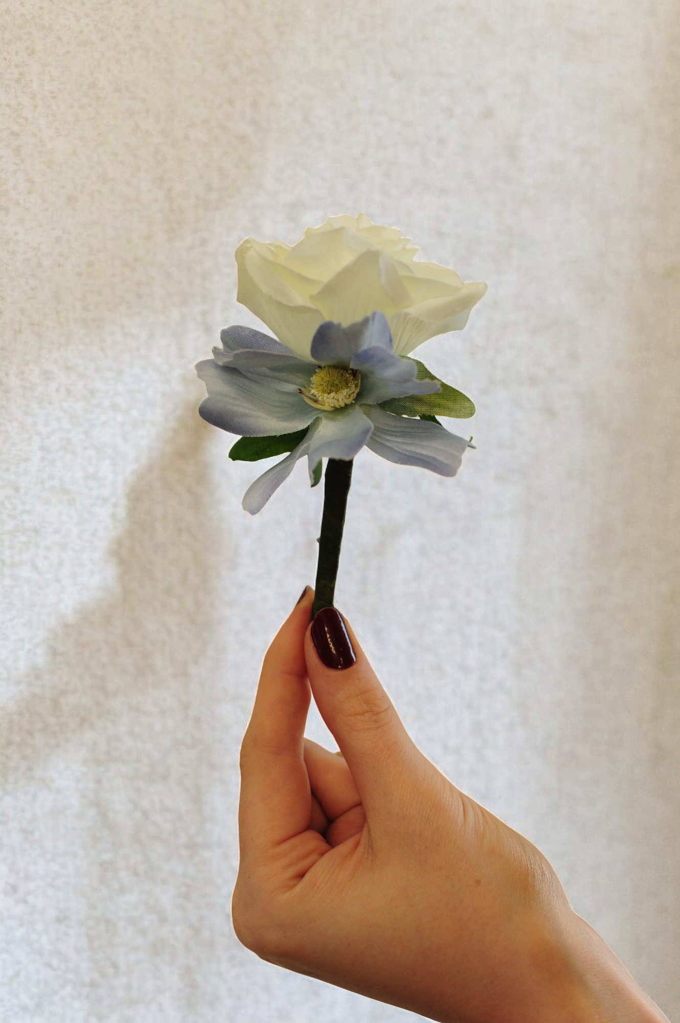 The Elizabeth buttonhole features an ivory garden rose and a baby blue poppy head. It comes complete with a lapel pin so it can easily be attached to a suit jacket