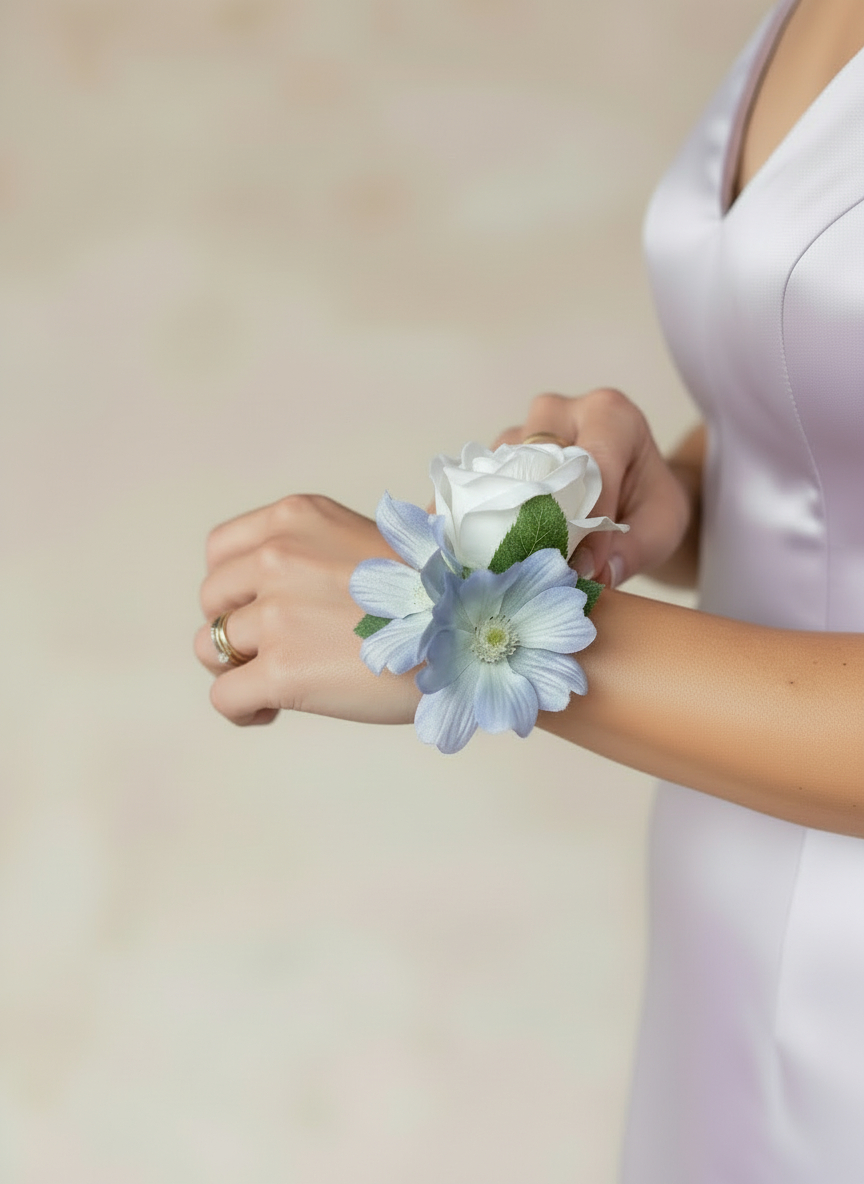 The Elizabeth corsage features a cream rose duo and a powder blue poppy bloom. Complete with a beautiful elasticated pearl bracelet which will compliment any outfit.