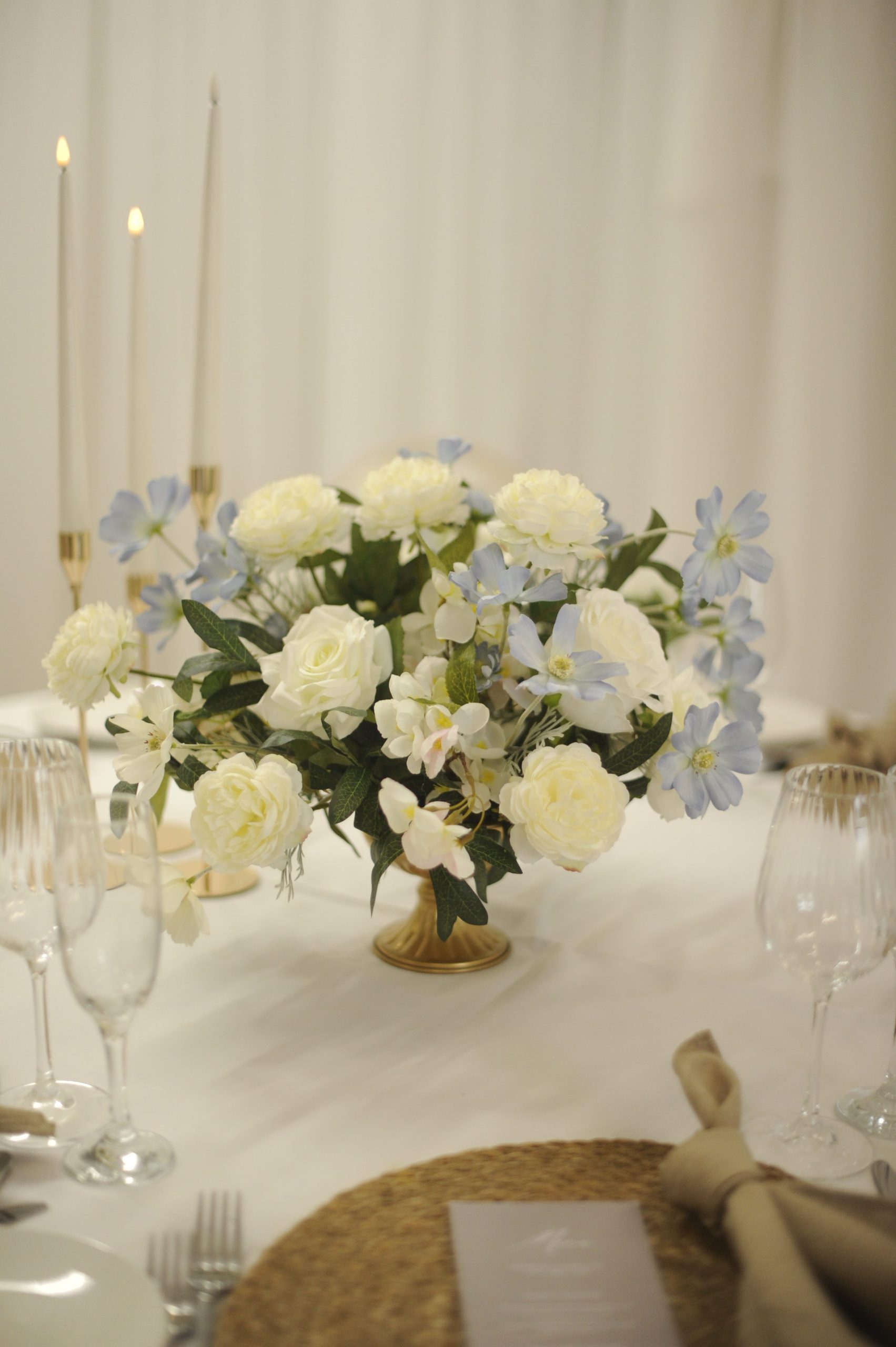 Elizabeth Floral Display brings together all the finest blooms from the Collection to create an option for aisle, ceremony or table styling. A soft and feminine collection, filled with beautiful roses, peonies and eucalyptus. Finished with a powder blue poppy.