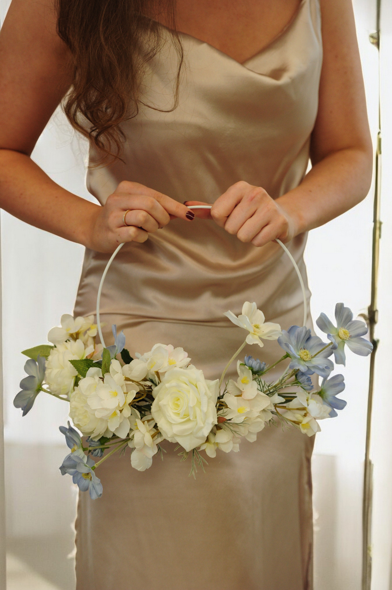The Elizabeth Floral Hoop features roses, peonies and eucalyptus. Finished with a dusky blue poppy. The blooms are attached to a 25cm diameter white hoop, making it easy to hold.