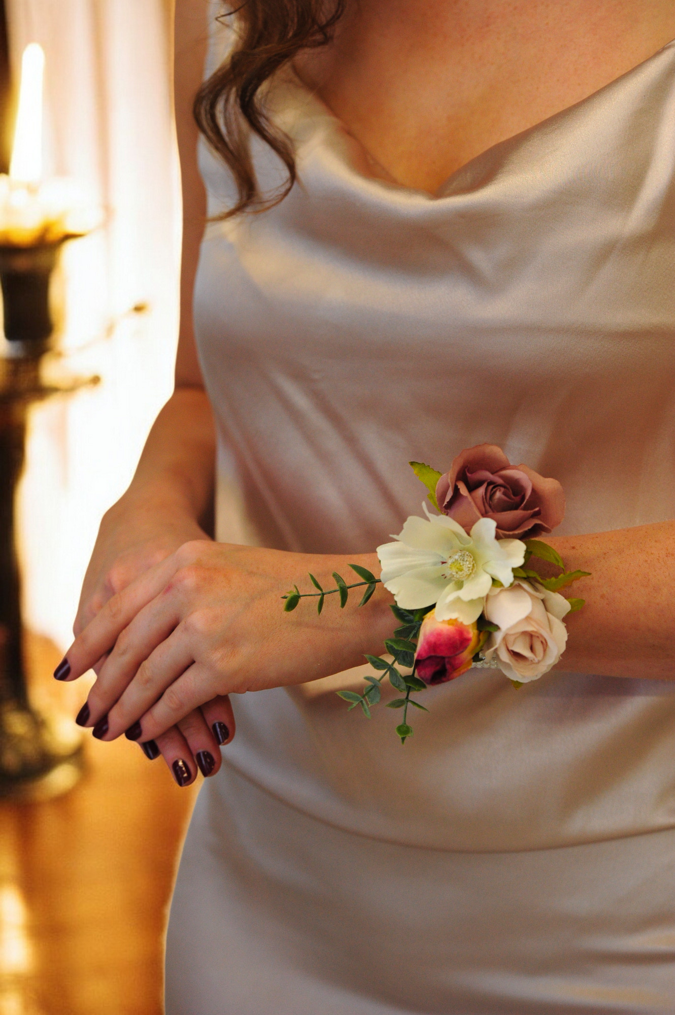 The Leah corsage features a burgundy blush rose, rose bud and light blush rose complimented with eucalyptus.It comes with on a beautiful elasticated pearl bracelet which will compliment any outfit.