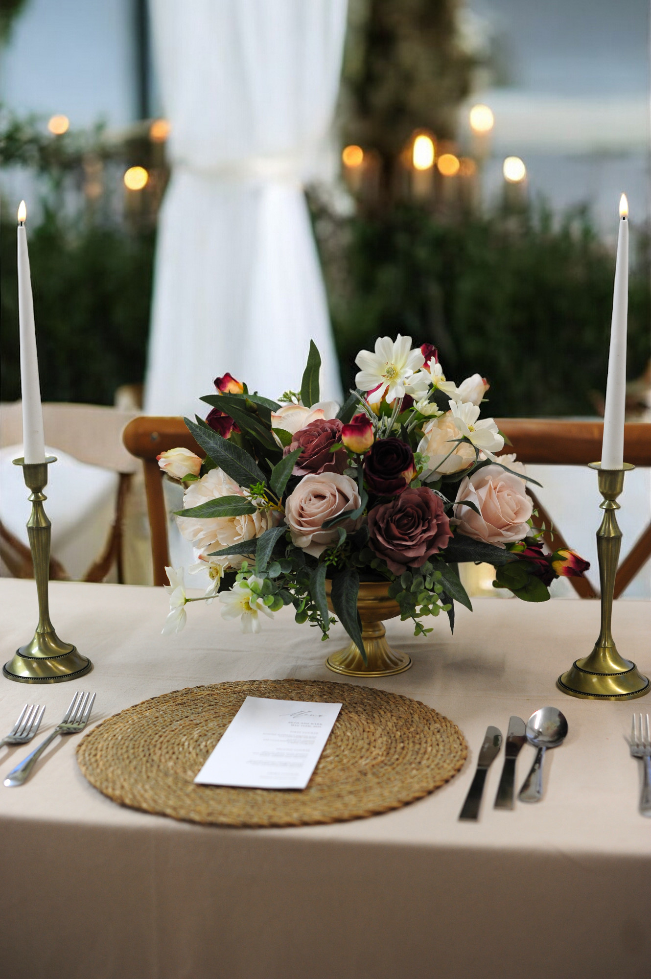 The Leah Floral Display brings together  a beautiful palette of burgundies, soft pinks, ivory and deep greens making this a firm favourite to compliment a wide range of bridesmaid tones. Florals include roses, peonies, poppies and eucalyptus. Come complete in an beautiful gold urn.