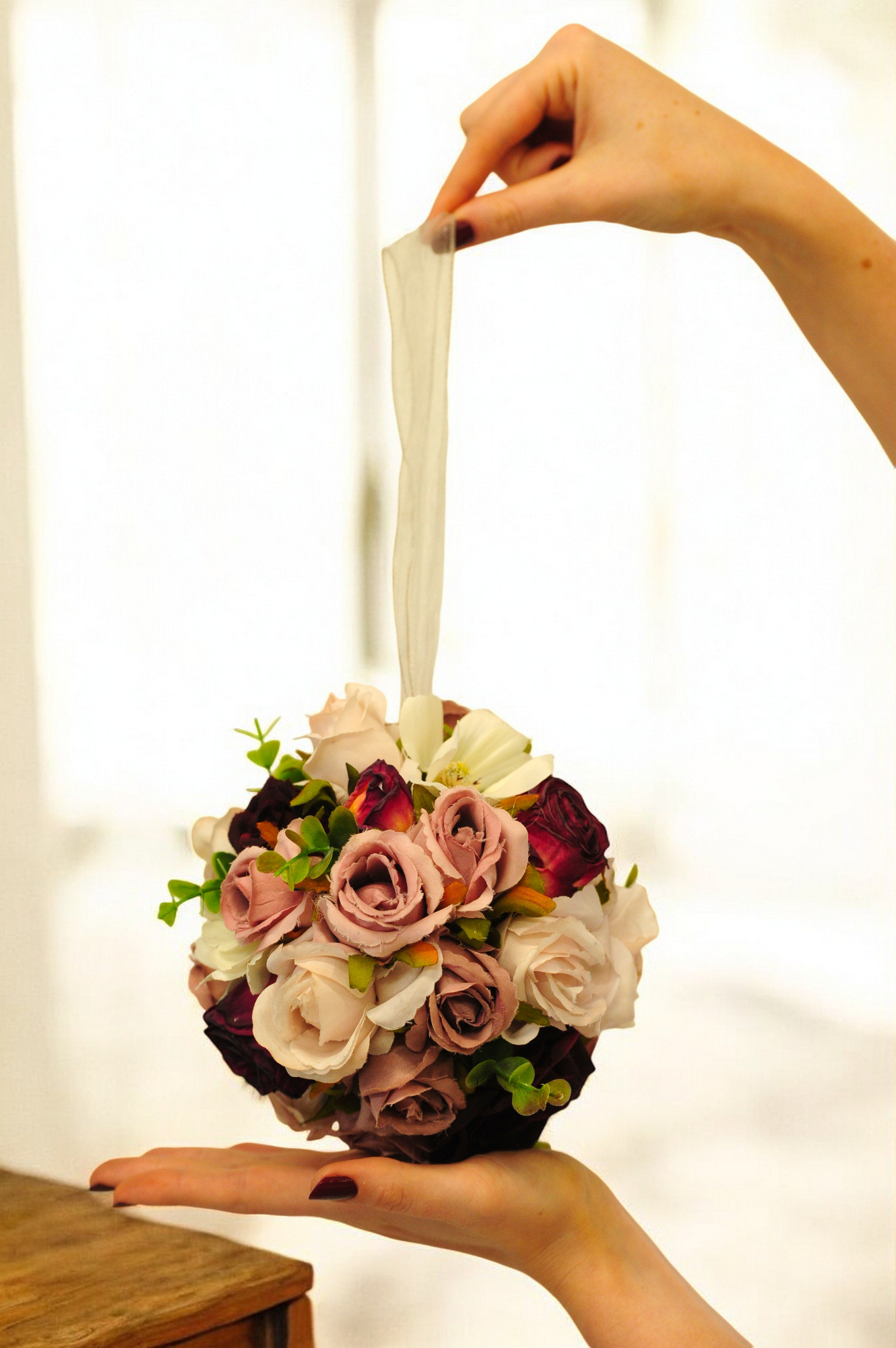 The Leah pomander features burgundy blush rose, rose buds and light blush roses complimented with eucalyptus. Completed with an ivory ribbon easy for little ones to hold.