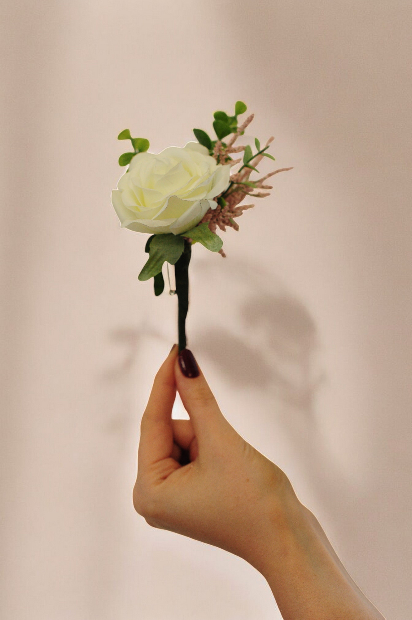 Olivia Buttonhole features an ivory garden rose and sprig of blush limonium. It comes complete with a lapel pin so it can easily be attached to a suit jacket.