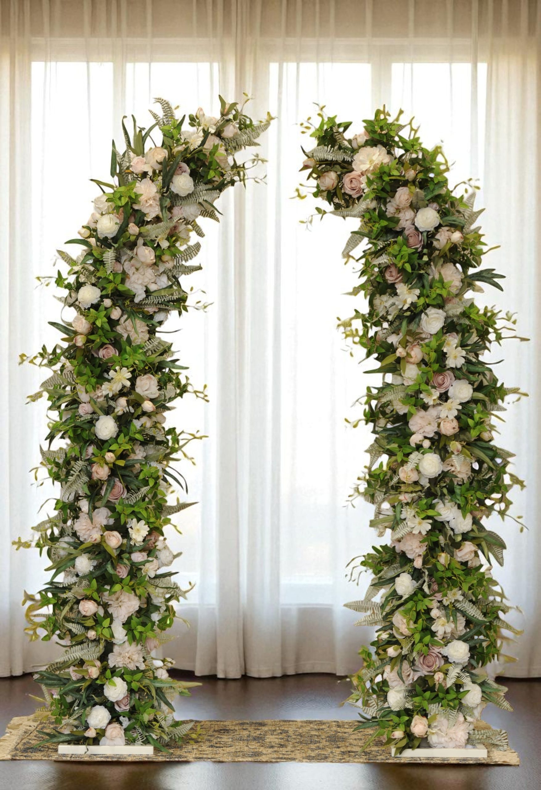 Frame your ceremony with our Olivia Floral Pillars – a romantic duo of lifelike silk blooms featuring white roses and lush greenery. Each pillar includes a sleek, sturdy frame that assembles in minutes, with floral sleeves that simply slide into place for a flawless finish.