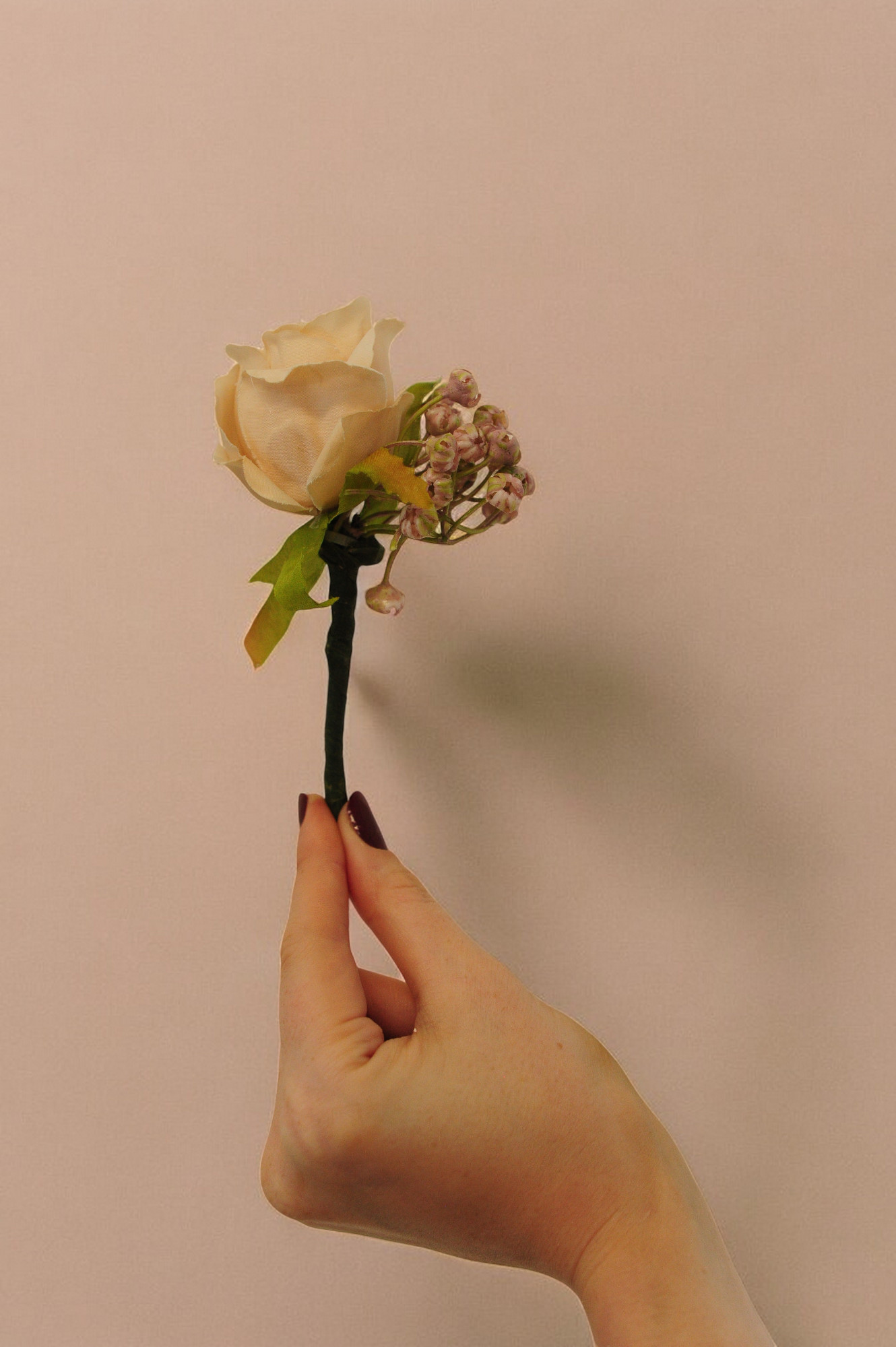 The Poppy buttonhole features peach vintage rose and  dried berries to compliment the bridal flowers. It comes with a safety pin included so it can be easily attached.