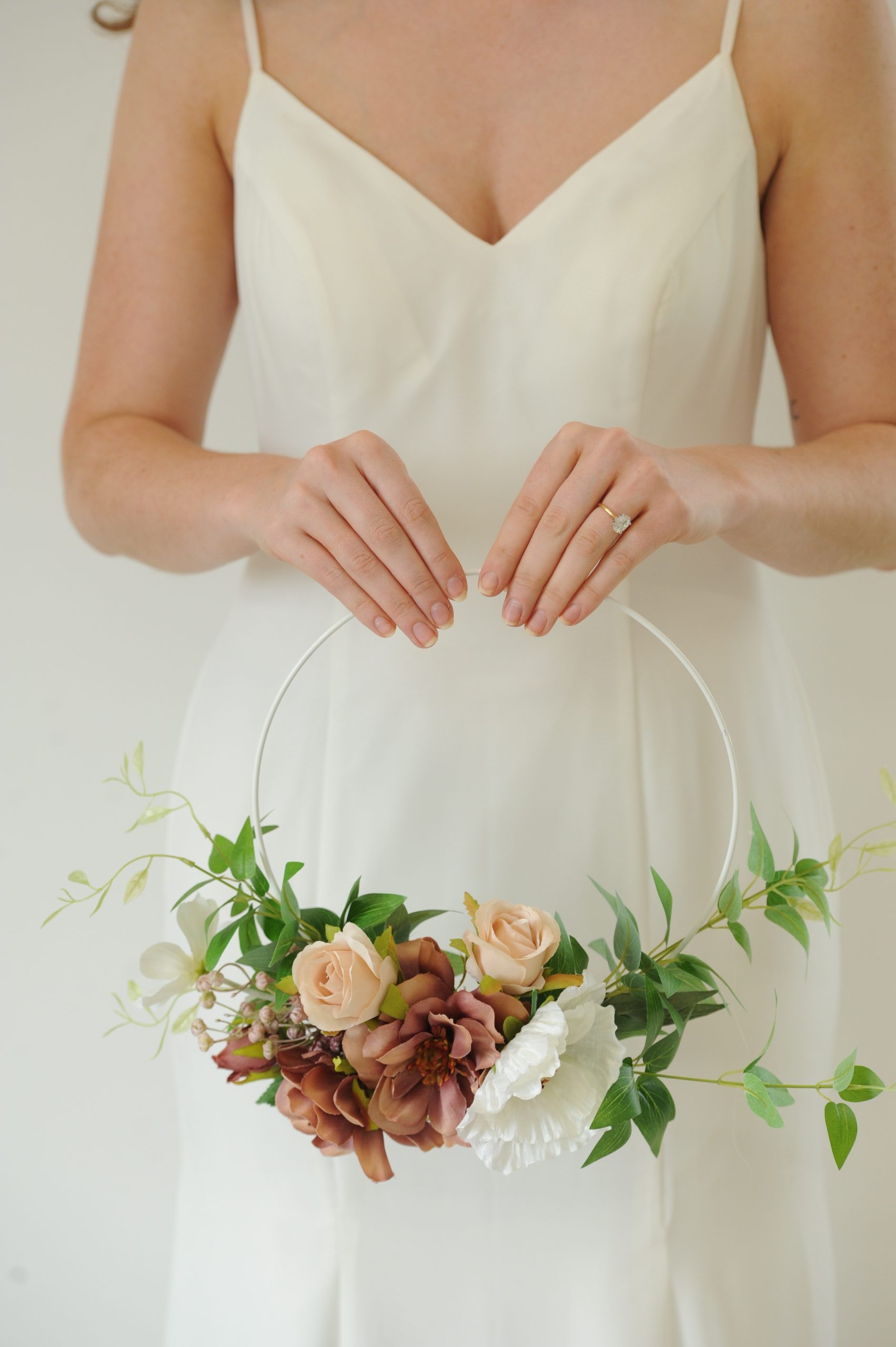 The Poppy floral hoop features burnt rust garden roses, cream rose buds with dried elements to compliment the bridal flowers. The blooms are attached to a 25cm diameter white hoop, easy for little ones to hold.
