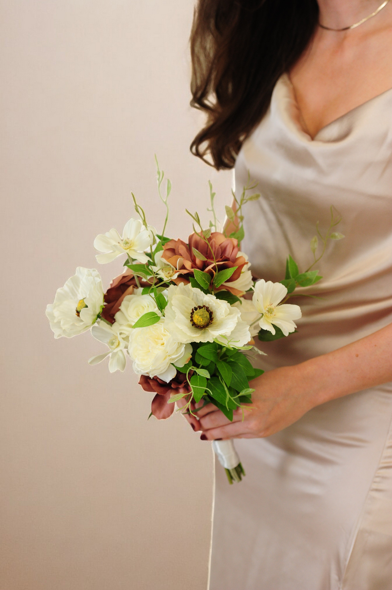 The Poppy Mini Maid features a subtle palette of taupe spray garden roses, poppy and loose wisteria botanicals. Tied with a simple satin ribbon around the stems. Premium Silk Florals.