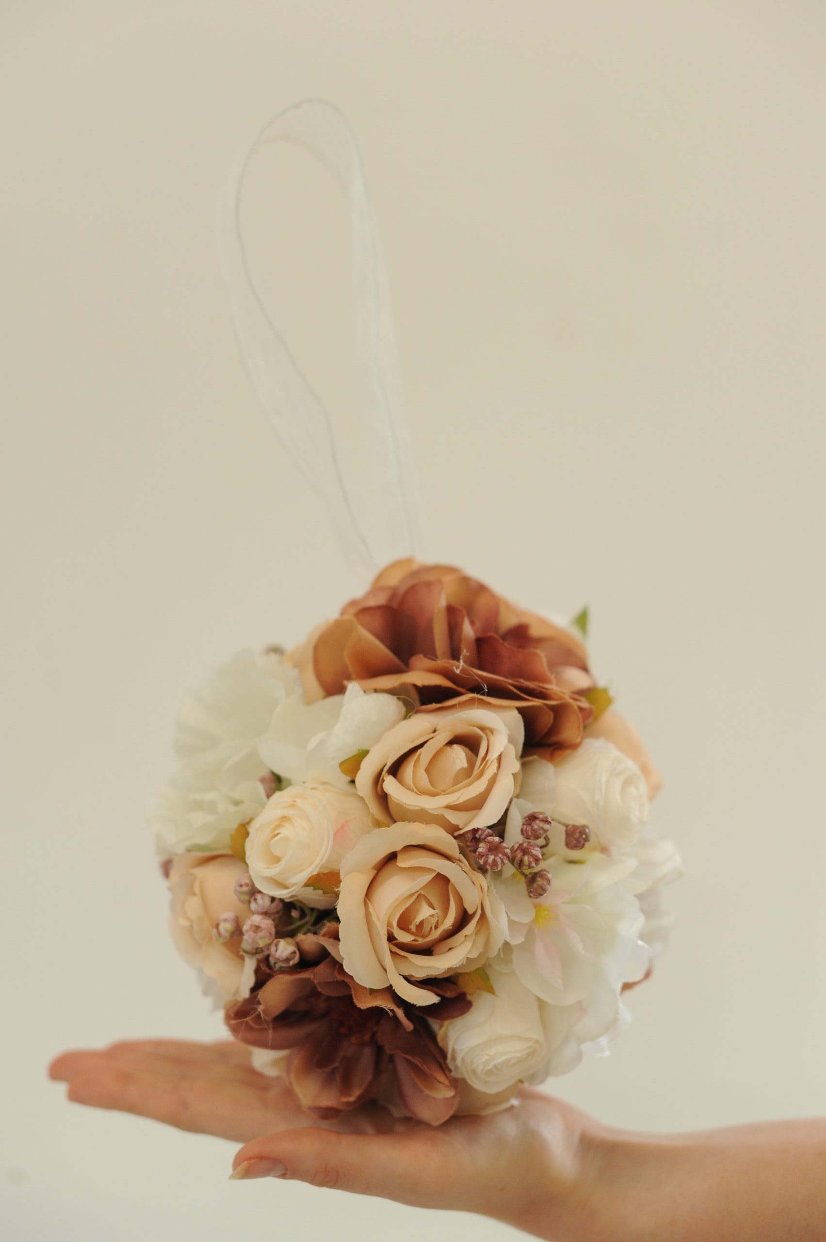The Poppy pomander features burnt rust garden roses, cream rose buds with dried elements to compliment the bridal flowers. Completed with an ivory ribbon easy for little ones to hold. Perfect for your flower girl.