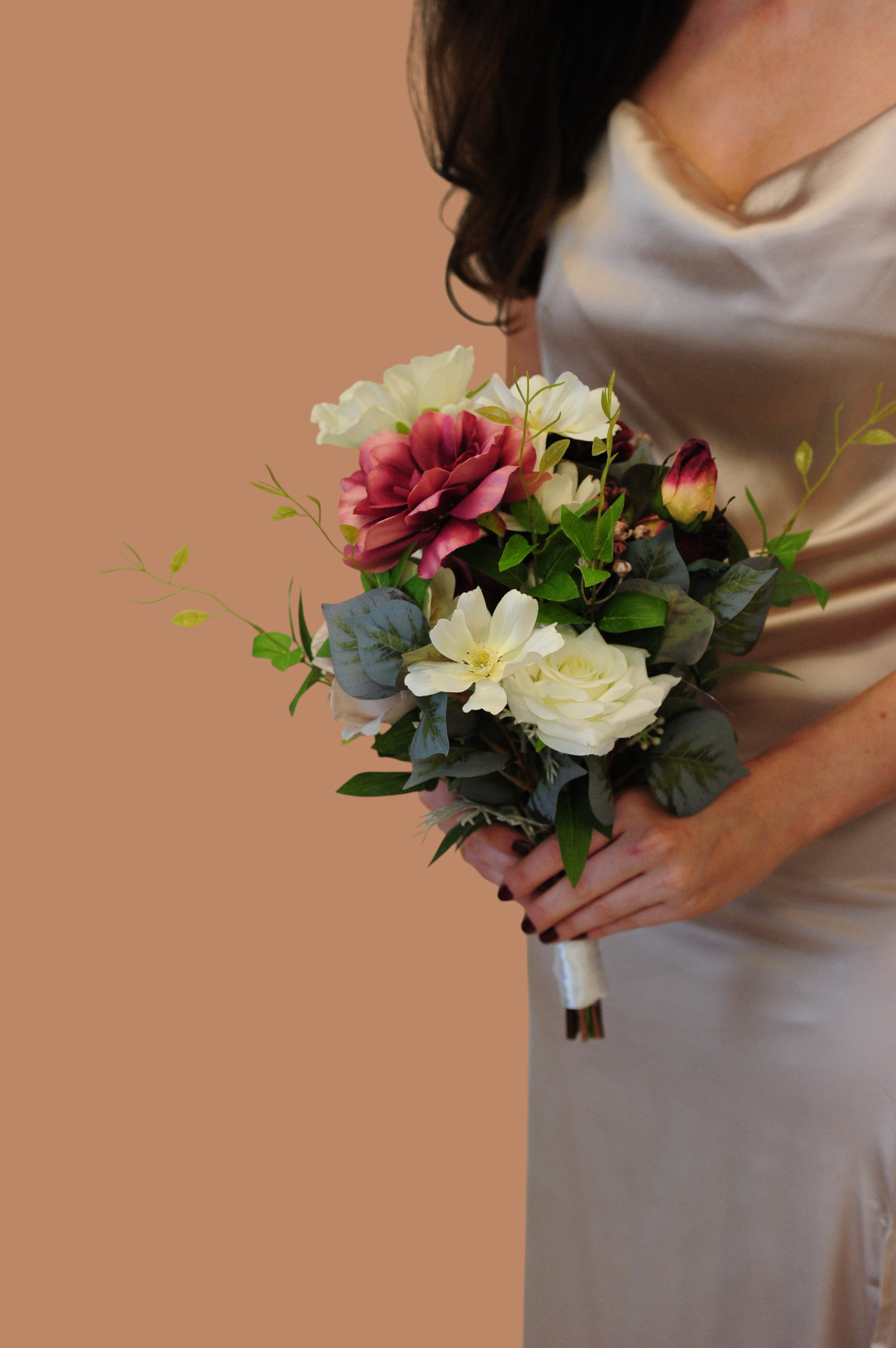 Sophia Mini Maid has been created with a delicate blend of deep blush garden berry, nicolli eucalyptus, and wisteria foliage. Sophia exudes timeless charm and natural beauty.