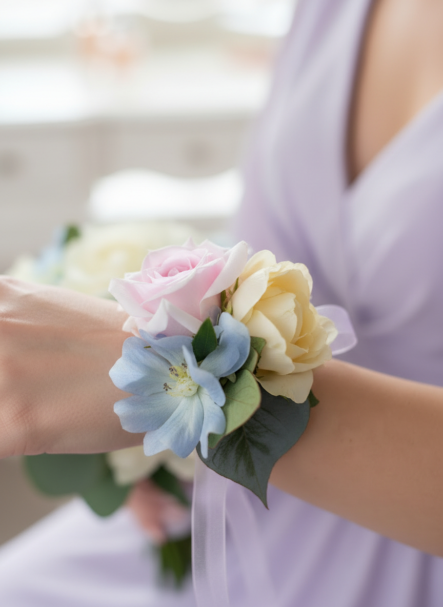 The Taylor corsage features peach soft pink and powder blue florals. Complete on a beautiful elasticated pearl bracelet which will compliment any outfit.